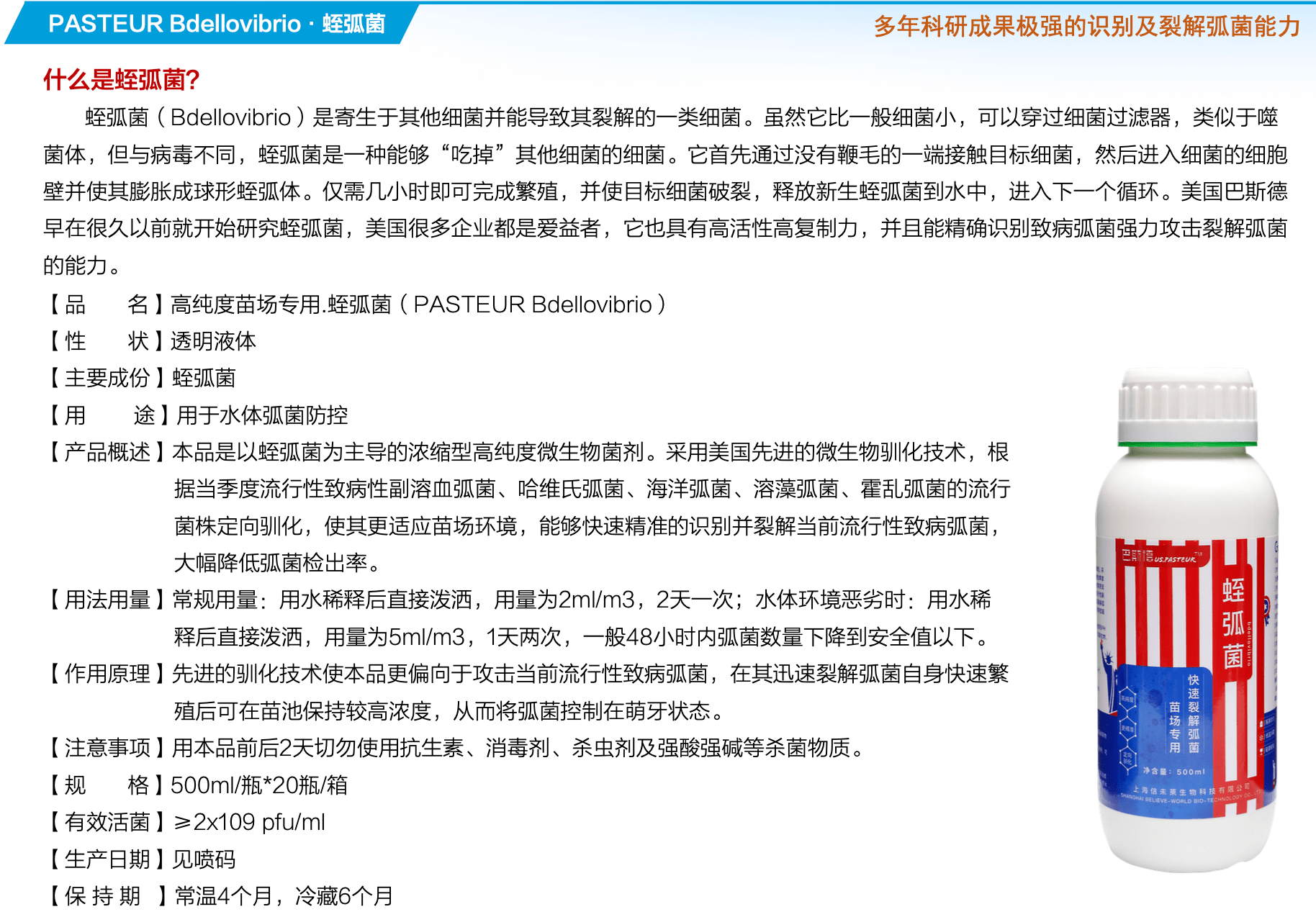 2. 蛭弧菌:以菌治菌的方式,通过使用蛭弧菌来预防和控制弧菌感染。我们的“蛭弧菌”产品是美国巴斯德公司多年科研成果,它采用的是美国先进的微生物驯化技术,根据当季度流行性致病性副溶血弧菌、哈维氏弧菌、海洋弧菌、溶藻弧菌、霍乱弧菌的流行菌株定向驯化,能够快速精准的识别并裂解当前流行性致病弧菌,可大幅降低弧菌检出率。蛭弧菌是应对弧菌超标问题的理想选择,有助于维护虾类养殖业的健康和可持续发展。
