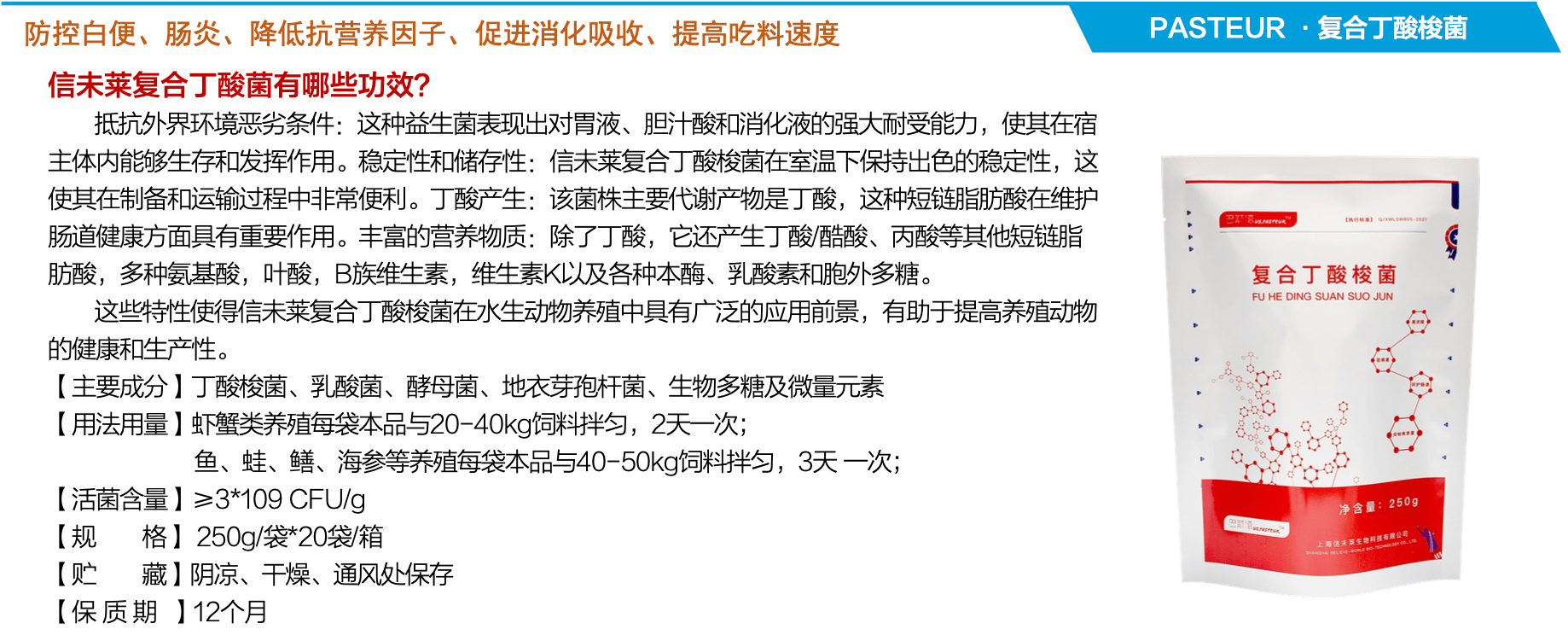 2. 利用有益菌:通过将乳酸菌或复合丁酸梭菌添加到饲料中,或者通过泼洒的方式,有助于建立有益菌在虾类肠道内的优势群落。这些有益菌将附着在肠道壁上,形成一种生物屏障,使弧菌难以粘附在肠道壁上,从而降低感染的风险。